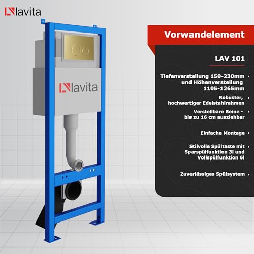KOMPLETT-PAKET: Lavita LAV 101 Vorwandelement für WC 40cm + Wand Tiefspül WC ROTO Spülrandlos + Bedienplatte LAV 200.4.5 Gold für Doppelspülung