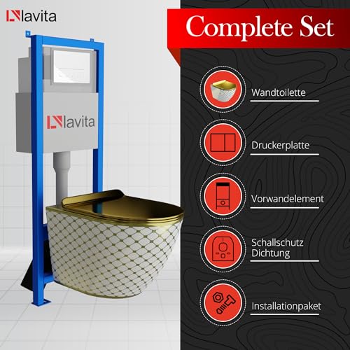KOMPLETT-PAKET: Lavita LAV 101 Vorwandelement für WC 40cm + Wand Tiefspül WC SOFI SLIM CHECKED GOLD Spülrandlos + Bedienplatte LAV 200.3.1 Weiß für Doppelspülung