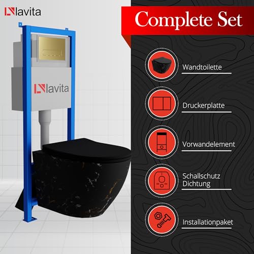 KOMPLETT-PAKET: Lavita LAV 101 Vorwandelement für WC 40cm + Wand Tiefspül WC SOFI SLIM FIRE Spülrandlos + Bedienplatte LAV 200.3.5 Gold für Doppelspülung