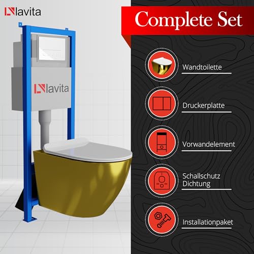 KOMPLETT-PAKET: Lavita LAV 101 Vorwandelement für WC 40cm + Wand Tiefspül WC SOFI SLIM GOLD/WHITE Spülrandlos + Bedienplatte LAV 200.3.1 Weiß für Doppelspülung
