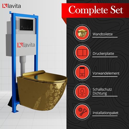 KOMPLETT-PAKET: Lavita LAV 101 Vorwandelement für WC 40cm + Wand Tiefspül WC SOFI SLIM GOLDEN EYE Spülrandlos + Bedienplatte LAV 200.3.4 Schwarz für Doppelspülung