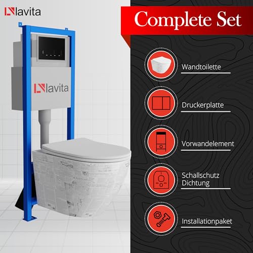 KOMPLETT-PAKET: Lavita LAV 101 Vorwandelement für WC 40cm + Wand Tiefspül WC SOFI SLIM PAPER Spülrandlos + Bedienplatte LAV 200.3.4 Schwarz für Doppelspülung