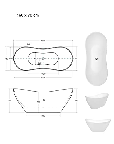 lukmebel LIVIA Freistehende Ovale Badewanne Weiß Ohne Überlauf Siphon Glänzend Mineralisch Durabe-Gelcoat Glatt Nicht Porös Batterie Nicht Im Preis Inbegriffen 160 cm X 70 cm