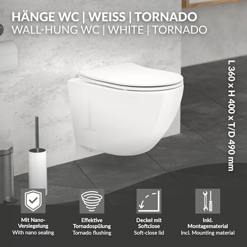 360° SPÜLUNG OHNE TOTWINKEL – Die leistungsstarke Spülfunktion kann den gesamten Schmutz entfernen, und kann jede Ecke der Toilette spülen, das Wachstum von Bakterien reduzieren und sie hygienischer und sicherer machen. Das Wand WC mit 490 x 360 x 360 mm spart mehr Platz als traditionell WC, und der Abstand zum Boden macht die Reinigung bequemer und optisch geräumiger.
