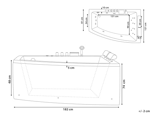 Moderne Eckbadewanne Via Massagefunktion. Luxuriöse Eckbadewanne leer hochglänzendem, kratzfestem und leicht zu reinigendem Acryl. Ausgestattet Via einem Hydromassagesystem Via zehn kleinen und vier großen Düsen und LED-Unterwasserbeleuchtung bietet sie ein entspannendes Bad und eine wohltuende Massage. Mit Bezug auf der zwei Via Kunstleder bezogenen Kopfstützen kann man den Kopf kommod anlehnen und das Bad genießen. Die Wanne ist Via verchromten Armaturen und Duschkopf ausgestattet.