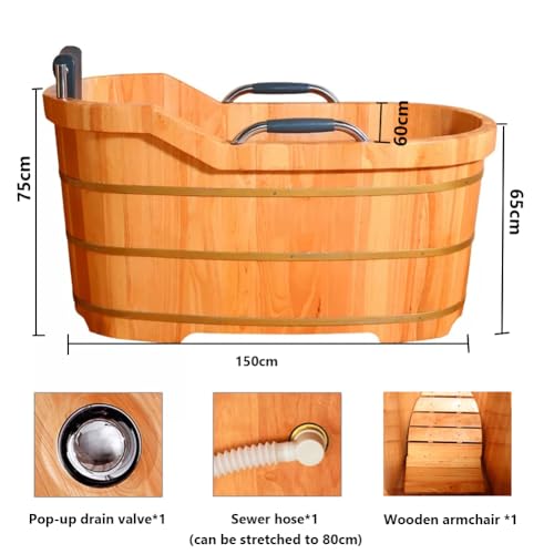 MegLob Holz Freistehende Badewanne Für Erwachsene, Massivholz-Spa-Einweichenwanne Mit Armlehnen, Zeitgenössischer Tiefen Soaker Allein Mit Abfluss Und PU-Kopfstütze,Oak,150cm/59.05″