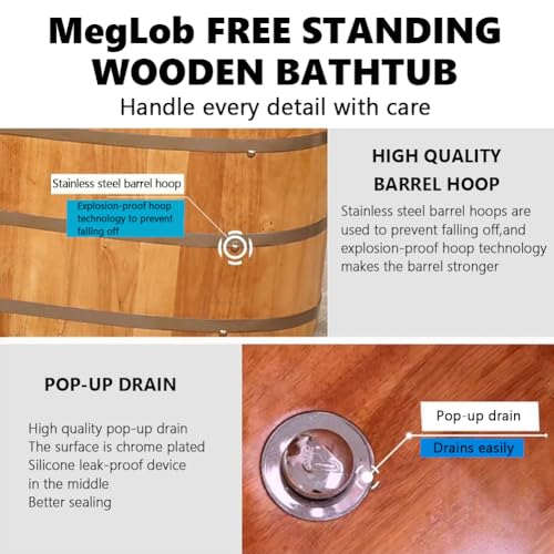 ☆ Versorgungsliste: Zusätzlich zur Holzbadewanne erhalten Sie auch eine PU-Kopfstütze*1, ein Popup-Abflussventil*1 und einen Entwässerungsschlauch*1.Meglob möchte jedem Kunden eine Badewanne detachieren, die für ihn bequem ist.Wenn Sie Fragen haben, können Sie uns bitte an uns kontaktieren!.
