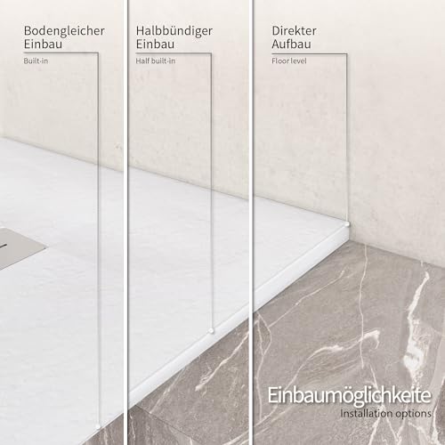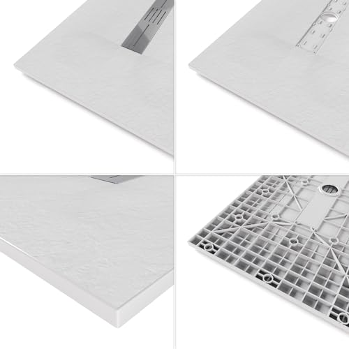 Moments of Glass SMC Duschwanne LUMIA 80×160 cm Weiß RAL9016 extra flache robuste Duschtasse aus langlebigem SMC, ANTI-Rutsch-Oberfläche in Schieferoptik inkl. Ablaufgarnitur und Edelstahl Deckel