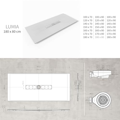 SMC Duschwanne LUMIA 80×180 cm von Moments of Glass: Die innovative Basis für Ihre Dusche! Die Duschtasse zeichnet sich durch eine hohe Langlebigkeit aus. Die Anti-Rutsch-Oberfläche ist antibakteriell und pflegeleicht. Der Ablaufsiphon und Edelstahl Deckel befindet sich im Lieferumfang.