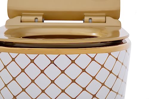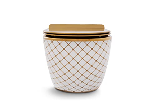 HÄNGE-WC: Die spülrandlose Toilette der Marke RD Luxury überzeugt durch ihr modernes Design und ihre hochwertige Qualität, was für längere Haltbarkeit und weniger Abnutzungsspuren sorgt. Das Weiß-Gold Hänge-WC mit Karomuster ist ein spülrandloses Designer-Wand-WC aus Keramik, das keine verborgenen Stellen aufweist, in denen sich Schmutz und Bakterien ansammeln können. Alles ist gut sichtbar, was die Reinigung erheblich erleichtert und für zusätzliche Hygiene und glänzende Sauberkeit sorgt.