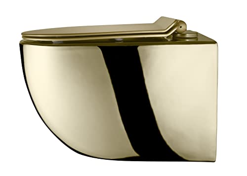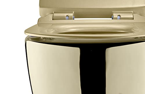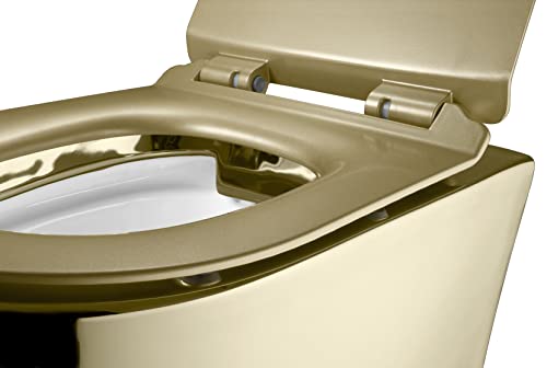 HÄNGE-WC: Die spülrandlose Bedürfnisanstalt der Marke RD Luxury überzeugt durch ihr modernes Design und ihre hochwertige Qualität, was für längere Haltbarkeit und abzgl. Abnutzungsspuren sorgt. Die Bedürfnisanstalt ist gold mit einem goldmatten Deckel und das Innenbecken ist weiß. Dank des spülrandlosen Designs gibt es keine verborgenen Stellen, in denen sich Sinken und Bakterien ansammeln können. Alles ist gut sichtbar, was die Reinigung erheblich erleichtert und für zusätzliche Hygiene und glänzende Sauberkeit sorgt.