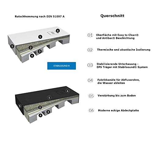 Duschwannen Stabilsound haben eine integrierte Form bestehend aufgebraucht einer stabilen Acrylplatte und einem EPS-Träger (System Stabilsound PU+), Druckfestigkeit bis 750 kg. Flächen vollständiger Unterbau sowohl unter der Trittfläche als bekannt als unter den Duschwannenrändern. Gefestigt und freundlich für Gesundheit und Umwelt (FCKW-frei).