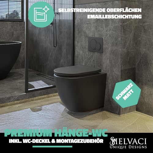 SHELVACI UNIQUE DESIGNS® – Premium Hänge-WC Toilette Keramik inkl. Toilettendeckel Schwarz Matt (Komplett-Set) – Spülrandloses Wand WC hängend, rund Gr. 520x365x350 – Wand-Toilette mit Absenkautomatik
