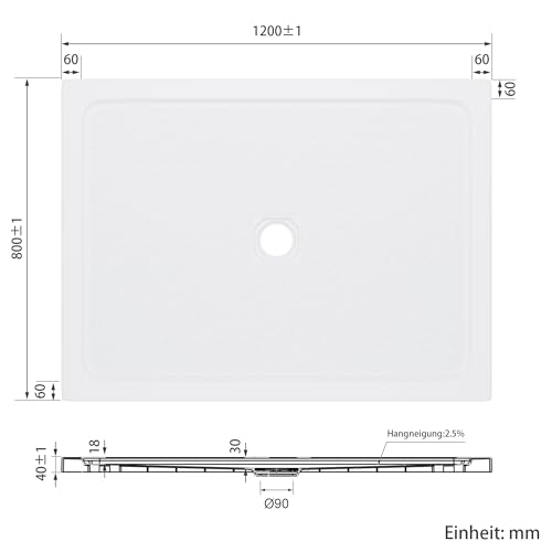 Kompakte Maße: 120x80x4 Zentimeter, Ablaufloch Durchmesser 90 Millimeter, Radius 550 Millimeter. Hinwieder 40 Millimeter übergewichtig, abgemagert darüber hinaus leicht.