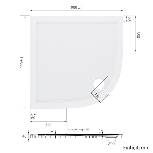 Kompakte Maße: 90x90x4 Zentimeter, Ablaufloch Durchmesser 90 Millimeter, Radius 550 Millimeter. Demgegenüber 40 Millimeter beleibt, mager weiterhin leicht.