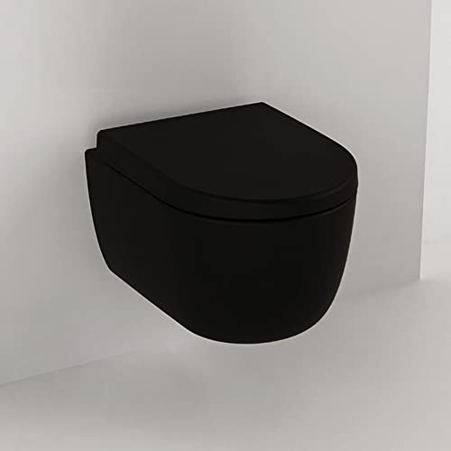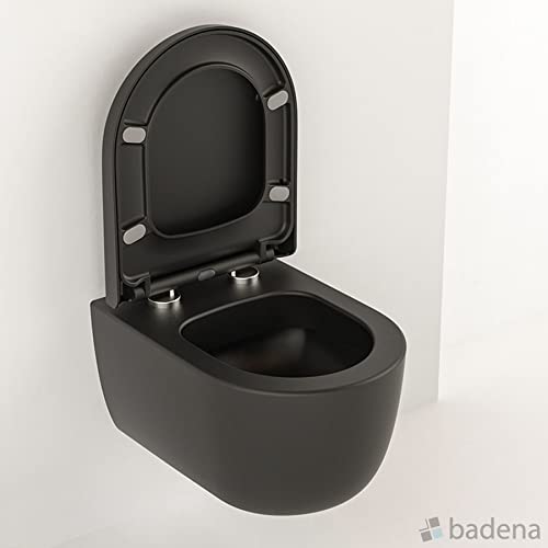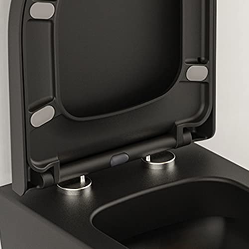 ELEGANTES DESIGN: Schwarz matte Hängetoilette aus hochwertiger Sanitärkeramik – randlos und hygienisch. Der WC-Sitz mit Absenkautomatik aus hochwertigem Duroplast bietet eine angenehme und ergonomische Sitzeigenschaft. Er ist per Knopfdruck abnehmbar und ermöglich somit eine noch einfachere Reinigung und mehr Sauberkeit. Die Verschraubungen für den WC Deckel sind dazu sehr robust.