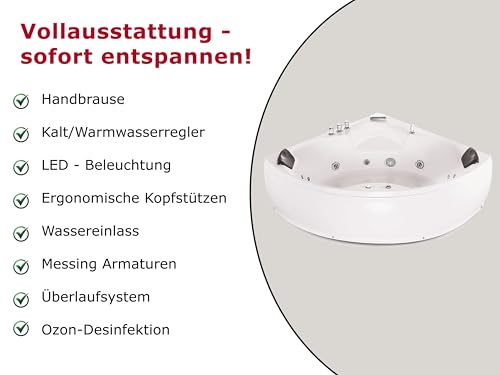 Platzsparendes Eck-Design für 2 Personen: Die Whirlpool Badewanne Monaco (145x145x56 cm) ist perfekt für die linke oder rechte Ecke im Badezimmer im Rahmen – ideal für Paare oder kleine Familien mit wenig Platz.