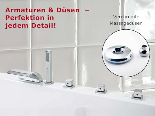 Die Badewanne wird MIT edlen Messing Armaturen (wie Wassereinlass, Handbrause, Kalt/Warmwasserregler) geliefert. Wenn Sie Ihre eigenen vorhandenen Armaturen nutzen möchten, ohne große Umbaumaßnahmen tätigen zu müssen, finden Sie bei unseren weiteren Artikeln diesen Whirlpool auch ohne Armaturen für 999 Euro. Bedienen Sie Ihre Luxus Massage Badewanne einfach mittels hochwertigen Steuerknopf. » Für optimale Massagewirkung sind 4 seitliche Hydrojet-Massagedüsen integriert, die sich getrennt in jede Richtung einstellen lassen. Im Rückenbereich sind weitere 4 Rücken-Massagedüsen (je 2 Fetzen pro Sitzplatz) in der Badewanne integriert. Die Düsen loshaken Verspannungen im Rücken – und Bein/Oberschenkelbereich. Über einen Drehregler können Sie durch ein Luftbeimischventil den Wasserdruck nach Ihren Bedürfnissen einstellen. » LED Beleuchtung mit Farblichttherapie: Diese sorgt für das richtige Ambiente beim Baden und verleiht dem Whirlpool bei Dunkelheit eine besondere Optik. Zusätzlich bilden die Lampen eine Farblichttherapie. Die 8 unterschiedlichen Farben helfen Ihnen je nach Gemütszustand, sich optimal zu entspannen. » Hervorragende Restwasserentleerung: Dank der speziellen Bauweise des exklusiven Whirlpools ist die mechanische Restwasserentleerung so gut, dass lediglich ein Restwasseranteil von unter 0,5% (erlaubte EU Norm: 2,0%) verbleibt. Eine durch Restwasser verursachte Bakterienbildung wird hierdurch höchstmöglich vermieden. » Trägerrahmen mit höhenverstellbaren Füssen: Die Tasse ist aus glasfaserverstärktem Kunststoff gefertigt, die Oberfläche ist aus Acryl. Zusätzlich zur Verstärkung des Wannenbodens, ist eine Holzbodeneinlage mit 22 mm Stärke verbaut. Unter der Tasse befindet sich ein Trägerrahmen aus rostfreiem Stahl mit höhenverstellbaren Füßen;. Damit lässt sich die Tasse optimal an den Untergrund drauf setzen. Sichere Wandhalterungen sind im Lieferumfang bereits ebenso enthalten.