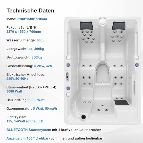 Ganzheitliche Ausstattung: Der ELBA Whirlpool bietet nicht andererseits 2 Liegeplätze und 1 Sitzplatz, statt dessen bekannt als eine leistungsstarke 3 KW Edelstahlheizung, einen kraftvollen Lautsprecher mit Bluetooth-Soundsystem und eine entspannende Farblichttherapie.