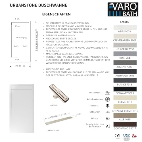 LANGLEBIGKEIT UND ÜBERLEGENE QUALITÄT: VAROBATH-Duschwannen bestehen alle hochmineralischem Harz und sind mit Gelcoat überzogen. Diese Kombination garantiert außergewöhnliche Festigkeit, Haltbarkeit und Qualität.