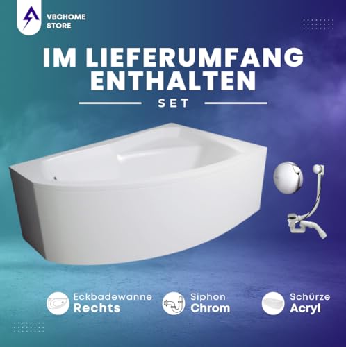 VBChome Badewanne 140×90 cm Acryl SET Schürze Siphon Wanne Ecke Eckbadewanne Weiß Design Modern Ablaufgarnitur Viega Simplex Wanne rechts Schürze Ablaufgarnitur Füße