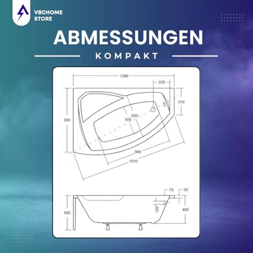 VBChome Badewanne 140×90 cm Acryl SET Schürze Siphon Wanne Ecke Eckbadewanne Weiß Design Modern Ablaufgarnitur Wanne links Schürze Ablaufgarnitur Füße