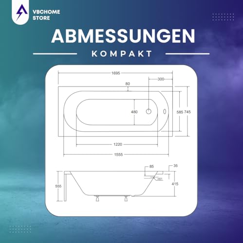 VBChome Badewanne 170×75 cm Acryl SET 3in1 Wannenträger Siphon Wanne Rechteck Weiß Design Modern Styroporträger Ablaufgarnitur in Chrom Viega Simplex