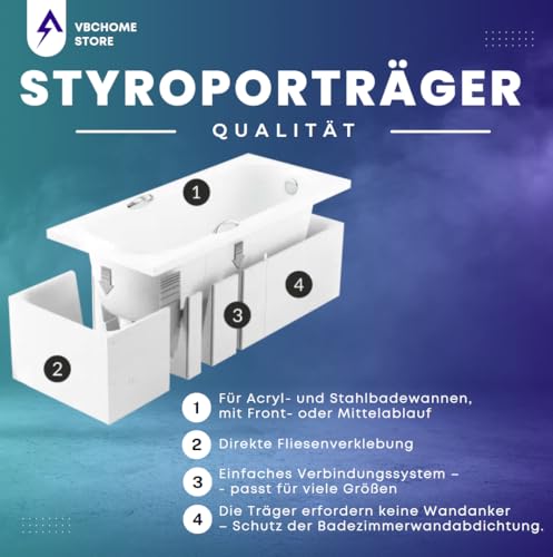 DER WANNENTRÄGER Durch die Verwendung eines Wannenträgers kann die Wanne schnell verfliest werden, so dass kein Abmauern notwendig ist | Universeller Badewannenträger, passt zu vielen anderen Badewannen. | Styropor (EPS-expandierbares Polystyrol) | Höhe Träger 65 cm | Kostenersparnis durch schnellere Montagezeit | Schall- und Wärmedämmung