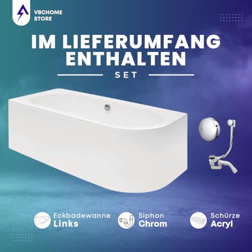 VBChome Badewanne 180×80 cm Acryl SET Schürze Siphon Wanne Ecke Eckbadewanne Weiß Design Modern Ablaufgarnitur in Chrom für 2 Personen links
