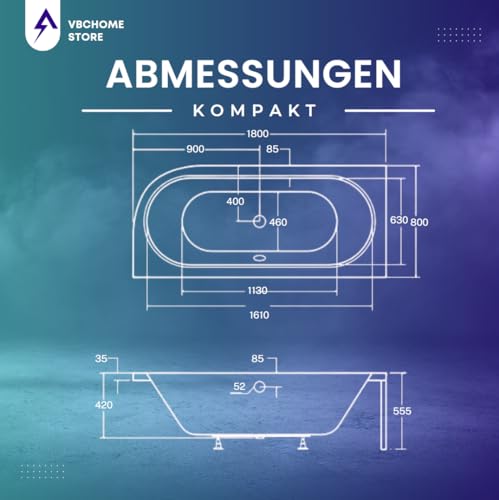DIE BADEWANNE 180 x 80 x 42cm für 2 Personen | Die Badewannen von VBChome in ALPINEWEiß sind besonders STABIL und belastbar. Die WÄRMEISOLIERUNG sorgt außerdem dafür, dass die Badewannen nicht fußkalt ist. Die ANTIBAKTERIELLE Oberfläche ermöglicht eine einfache REINIGUNG , ist sehr hygienisch und zusätzlich beständig gegen Feuchtigkeit oder Schimmelpilze. Das integrierte GEFÄLLE lässt das Wasser reibungslos abfließen. Nutzinhalt ca. 139 Liter