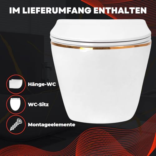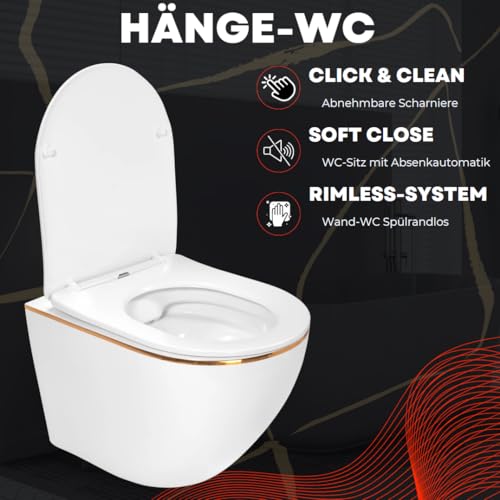 VBChome Hänge-WC Spülrandloses aus Keramik mit Toilettendeckel WC-Sitz aus Duroplast Absenkautomatik Rimless SoftClose-Funktion Tiefspüler Toilette Weiß Gold Edge Rechteckige Form Wand WC