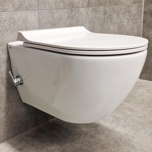 Viba Bidet WC spülrandlos wandhängend mit Softclose Sitz Kaltwasser Armatur – Taharet Toilette WC mit Bidetfunktion aus Keramik, einfach zu reinigen