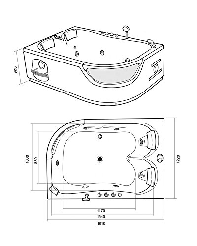 WIE IM BILD 100% EINFACHE UND SCHNELLE MONTAGE! TECHNISCHE KENNZEICHEN Dimensionen der Badewanne: Basis 180 x 120 Cm Höhe 60 cm Pumpe 1,5HP Whirlpool Luftdüsenkontrollsystem Talent zur Desinfektion ebenso Sterilisation 2 Kopfstützen 7 große verchromte Düsen 2 kleine Düsen Schutzsystem gegen elektrischen Schlag (automatische Wahrung) Bedienfeld (Computer) Radio 1 multifunktionale Dusche 1 Kommutator