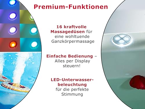 - ✔ LED-Farblichttherapie: Unterwasserbeleuchtung mit 8 wechselbaren Farben Statt dessen stimmungsvolles Licht.