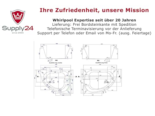 Erleben Sie Entspannung auf höchstem Niveau mit der Whirlpool Badewanne Titan von Supply24 since 2004 – gefertigt in Deutschland. Die 25 verchromten Massagedüsen losschnallen wissentlich Verspannungen im Rücken-, Bein- und Seitenbereich. Die Kombination aufgebraucht Wasser- & Luftdüsen sowie die leistungsstarke Heizung mit Luftvorwärmung garantieren ein wohlig warmes Spa-Erlebnis. Die integrierte Ozon-Desinfektion reinigt ganz Leitungen hygienisch und effektiv. Für das richtige Ambiente sorgt die LED-Farblichttherapie mit 8 wechselnden Farben. Über den komfortablen Touch-Computer steuern Sie ganz Funktionen – inklusive Radio mit Bluetooth für Ihre Lieblingsmusik beim Baden. Die Whirlpoolwanne ist wahlweise mit hochwertiger Armatur aufgebraucht verchromtem Messing erhältlich – oder ohne Armaturen, falls Sie eigene Systeme nutzen möchten. Durch die zweiteilige L-Frontschürze ist die Wanne sowohl für linke als aka rechte Eckmontage adäquat. Dank der massiven Bauweise mit Stahlrahmen, einer Holzbodeneinlage und höhenverstellbaren Füßen steht die Badewanne zäh auf nahezu jedem Untergrund. Die Belieferung erfolgt gefestigt per Spedition frei Bordsteinkante. Hinweis zur Sicherheit: Whirlpools sind elektrische Geräte der Schutzklasse 1. Für den Anschluss im Bad gelten die DIN VDE 0100-701 Normen. Der Anschluss muss durch qualifiziertes Fachpersonal erfolgen (z. B. Sanitärfachbetrieb).