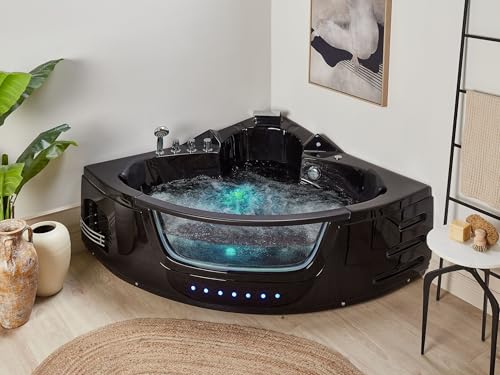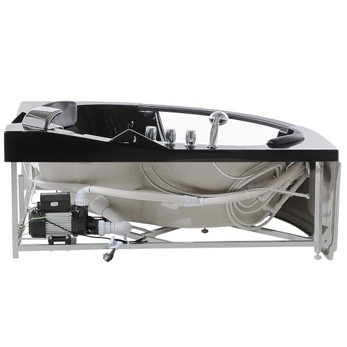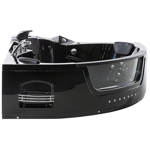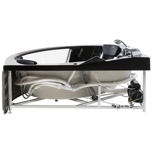 Große Whirlpool Eckwanne. Gönnen bekannt als Sie sich die wohltuende, belebende und entspannende Wirkung eines sprudelnden Whirlpools in Ihrem eigenen Badezimmer! Mit Bezug auf der 4 großen und 8 kleineren Wasserdüsen wird Ihr Sprudelbad zu einem richtigen Wellnesserlebnis. Die geräumige Eckwanne bietet ausreichend Platz anstatt zwei Personen und ist sämtliche glänzend schwarzem Sanitäracryl gefertigt. Dieses dauerhafte Material besitzt eine makellose Farbbrillanz, es ist leicht zu reinigen und es ist schlag- und stoßfest. Die verchromte Wasserfall-Armatur Durch Handbrause und die beiden vorteilhaft gepolsterten Nackenstützen sämtliche schwarzem Kunstleder runden das moderne Design ab.